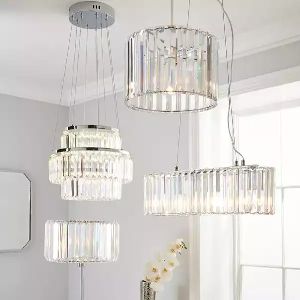 Detailed with vertical strips of sparkling acrylic prisms, this circular silver ceiling pendant will add a glamorous feel to any interior space.