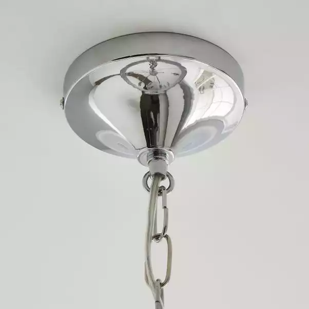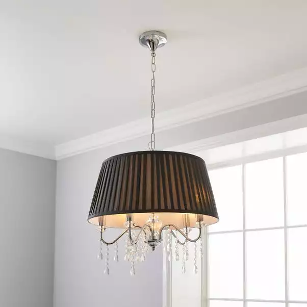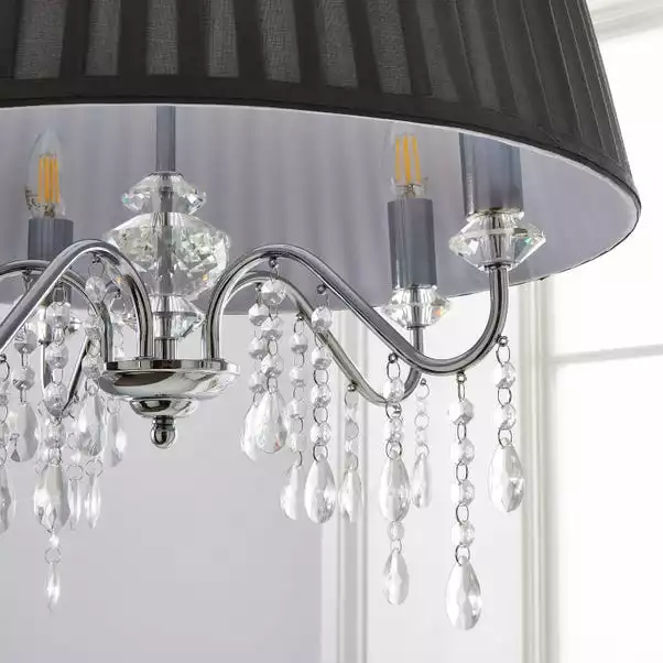 Add a glamorous touch to your décor with the Dorma Genevieve 5 Light Ceiling Fitting. Exquisitely designed with a modern chrome base, detailed with stunning clear crystals and faceted crystal droplets. This luxurious piece is complete with a circular Grey faux silk shade with a double taped trimmed detailed finish and suspended from a height adjustable chain set. Matching Dorma Genevieve pieces are available to help coordinate your décor.