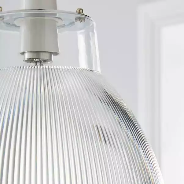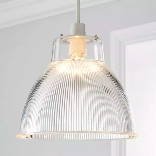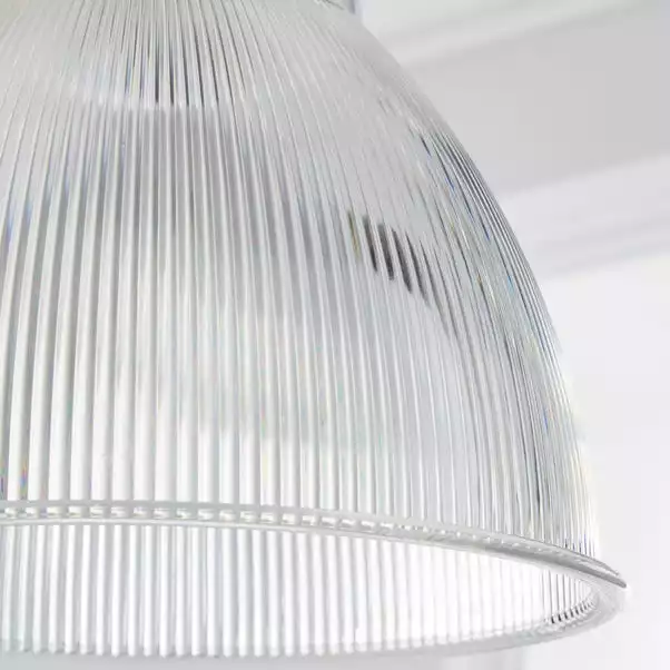 The Alanya east fit pendant has a dome shape shade, with chrome detail and ribbed texture. Made from clear plastic this will give an modern look to your home.