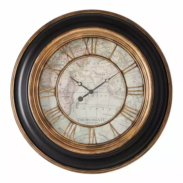 Add a classical antique style to your walls with the unique antique map wall clock. Featuring a wide black frame with gold accents and classic roman numeral figures. Complete with a sunken antique map clock face and black hands, this clock would add an elegant touch to any home.