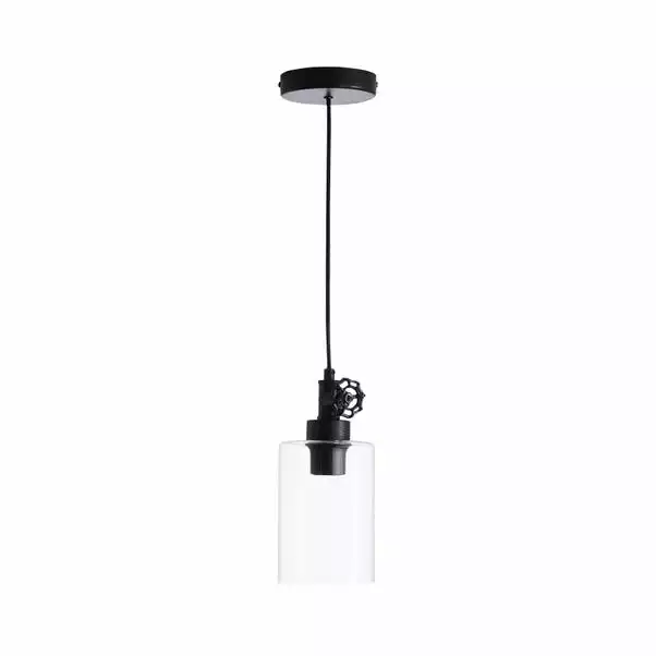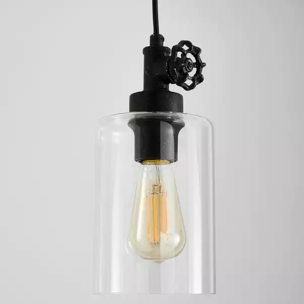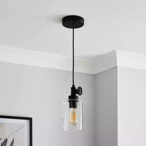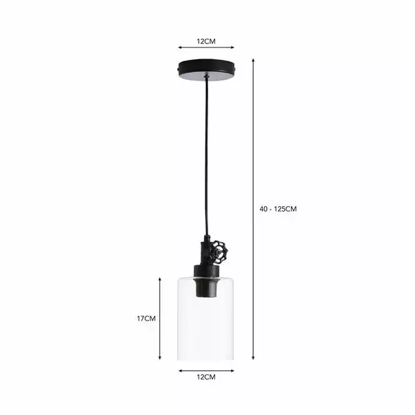 Perfect for adding a contemporary industrial look to your home. The Bates 1 Light Industrial Ceiling Fitting features a stylish distressed black metal frame with decorative wheel details, paired with a clear cylindrical glass shades and a height adjustable cable. This ceiling fitting is dimmable compatible with a suitable bulb and dimmer switch. Matching items are also available from the Bates range to help coordinate your home.