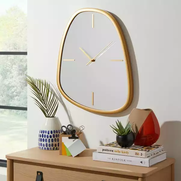 Add a luxurious finishing touch to your wall with this gold framed Pebble wall clock. Designed on a silver mirror, this pebble clock features simple styled hands with a numeral bar in a contrasting gold colourway. This stylish pebble clock will look beautiful with a range of home decors.