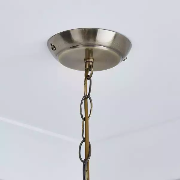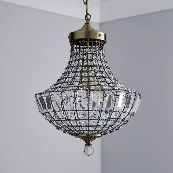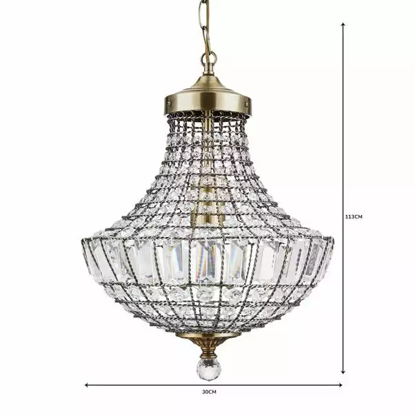 Featuring a metal chain design in an antique brass finish, this hanging ceiling fitting is decorated with intricately cut crystal glass embellishments. This light only requires 1 bulb. This piece is dimmable compatible, making it both an attractive and practical product.