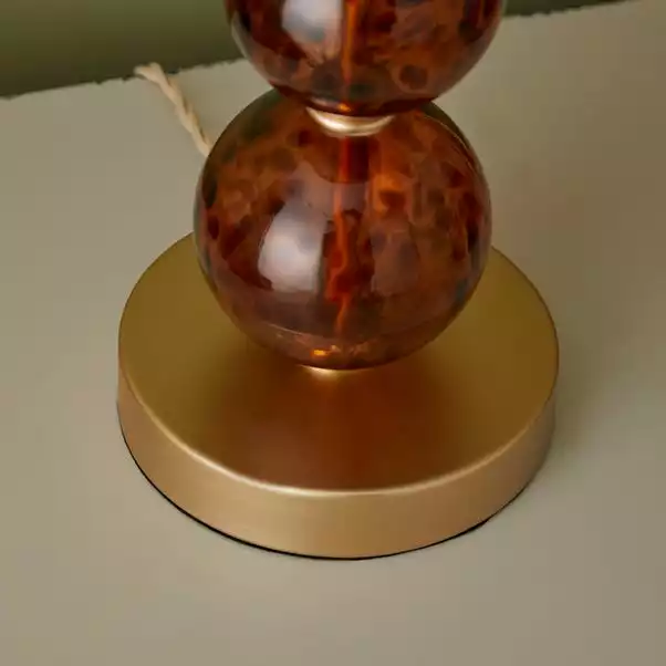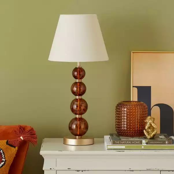Light up your life with this contemporary and stylish table lamp. Comprising of four glass spheres with beautiful tortoiseshell detailing, it can be displayed in your living room or bedroom for that extra luxurious look. Finished with a simple but timeless neutral coloured shade.