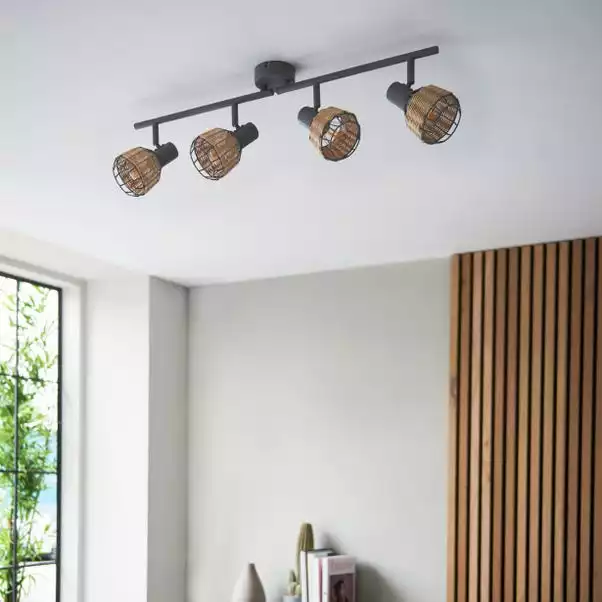 Add a natural touch to your home with this modern Ohio 4 Light Spotlight Bar. Designed with a matt light grey metal base and 4 natural wicker rattan spotlight shades, beautifully woven around the grey metal wire. Complete with a grey split bar that allows further adjustment options. This spotlight will look beautiful in any room and you can even coordinate your home with matching family items. Dimmable compatible with a suitable light switch and bulb.