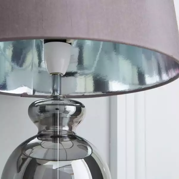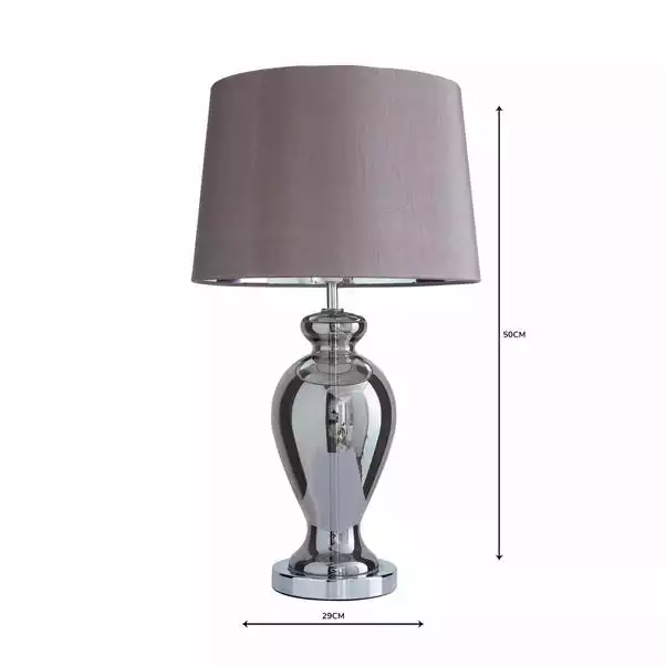 Featuring an urn shaped base, this chrome glass table lamp is finished with a grey faux silk shade and silver lining.