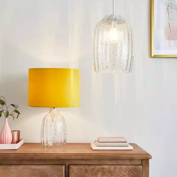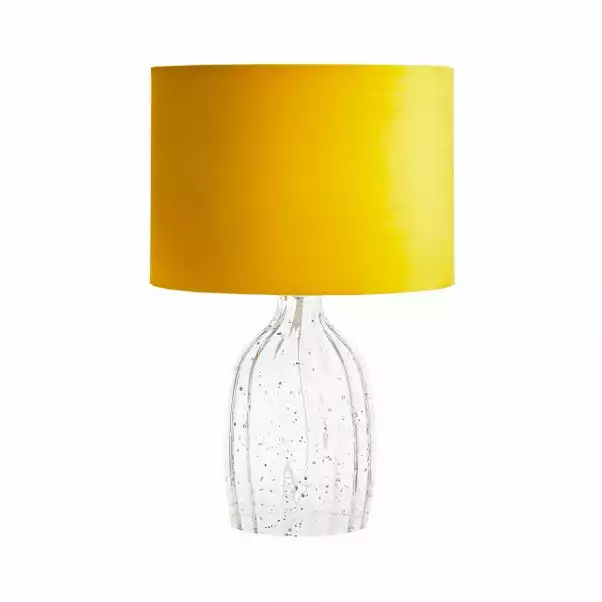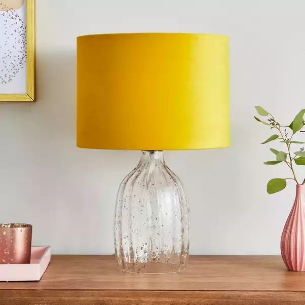The Tamara Table lamp features a ochre velvet shade on a clear glass bass. Within the glass lies gold foil detailing adding a hint of glamour to the table lamp. The switch is in-line and is attached to the 1.5m white fabric cable. A single SES/E14 candle bulb is required for this lamp however the bulb is not included. Coordinating Tamara family items are available.