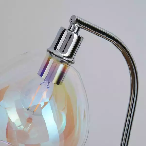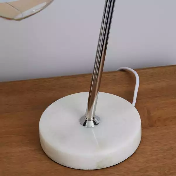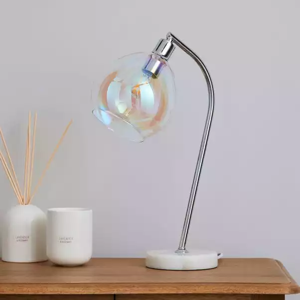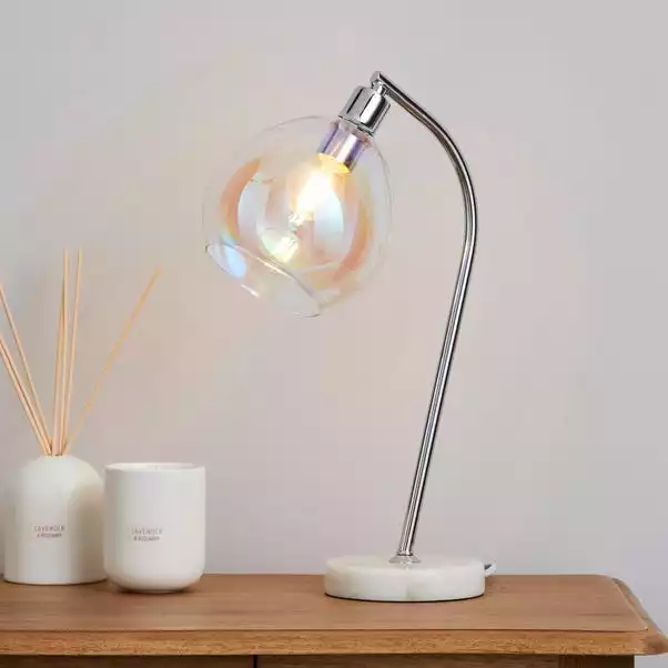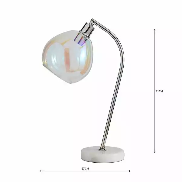 Made from durable glass in a dome shape, this table lamp has a solid marble base and an iridescent finish. With an inline switch and a cable length of 120cm.